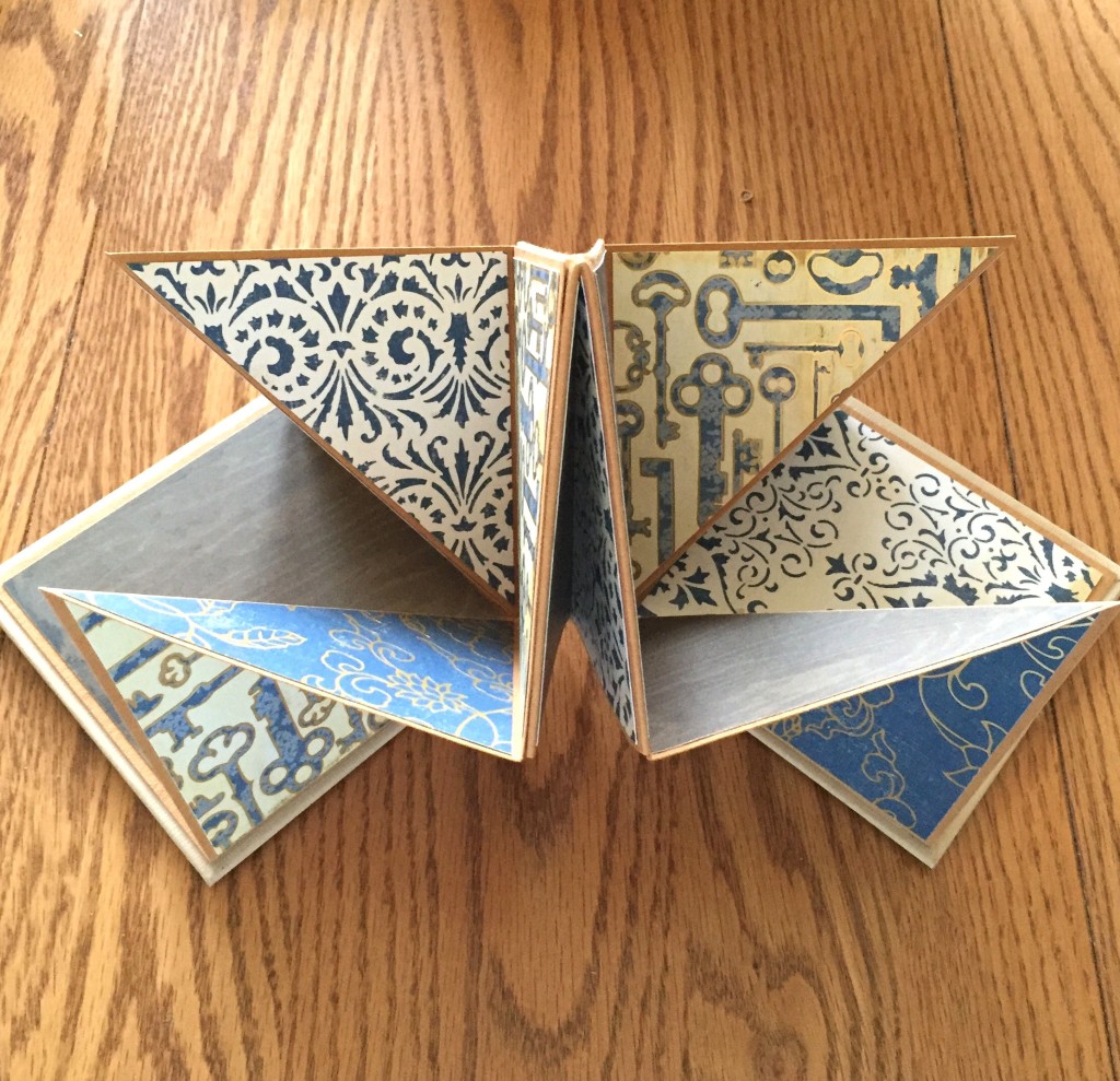 Now, I have a confession to make. This is actually the second version of the explosion book I made. The first version used good quality Bazzill card stock for the pages, a heavy-weight textured paper that ordinarily is great for book projects. But not this one. If you decide to cover both sides of the paper, the paper gets stressed wherever fold lines intersect, and after just a few openings and closings of the book, it can begin developing holes at those intersections. Not good! I thought about reinforcing these areas with extra paper, even fabric, but this adds bulk to the book and is just plain unattractive.