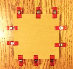 So, I gritted my teeth and started all over, keeping the cover from the first explosion book, but nothing else. What I used instead of card stock for the pages was Kraft-Tex, a heavy-duty “paper fabric” that sells in 18 or 19-inch by 1-1/2 foot rolls in kraft paper brown, black and white. What’s special about this paper is that you can cut it, sew it, paint it, sand it, emboss it, wash it, and throw it in your dryer. In other words, it’s miracle paper—perfect for a book whose pages are folded and re-folded umpty-ump times. I “trained” my paper to stay folded in the directions needed for this book by clipping the pages into place with Clover Wonder Clips, normally used for sewing.