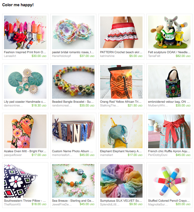 So, I’ll celebrate completion of tax returns with a splash of color by curating an Etsy treasury—something that always makes me happy. If you click on the large image below, you’ll be taken directly to Etsy and can check out the wonderful products that are shown. And while I’m on the subject, take a special look at the items from Katrin of Katrinshine (living in Italy, but originally from Russia) and Eugenie of Mulberry Whisper (from Uzbekistan). Both women are the newest members of my blogging Etsy team, Blogging Business Artisans. I’d like to extend a warm welcome to both of them!