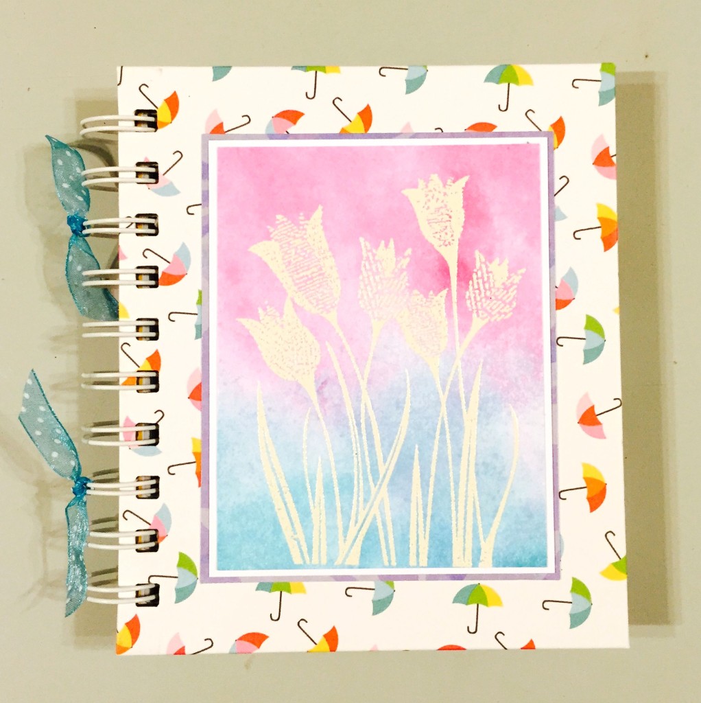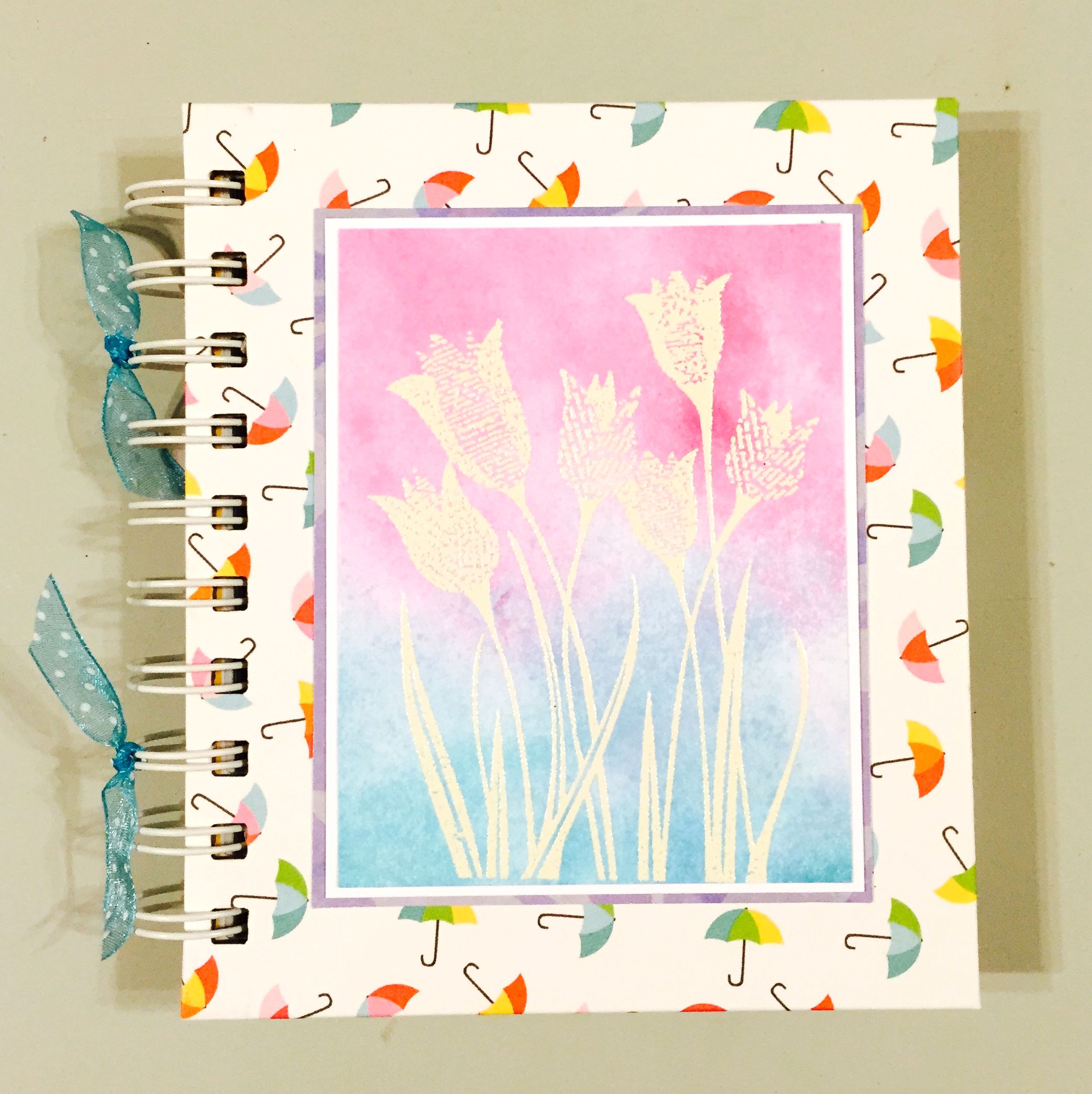 The covers of the address book were fun to design. I wrapped bookboard in Umbrellas card stock from Echo Park’s Sunny Days Ahead collection. It’s absolutely perfect for the April Showers challenge. Of course, once it begins raining, May flowers follow, quite often with tulips and daffodils, so I knew I needed to add some flowers to the front cover. After all, it wouldn’t be a MisterPenQuin book if it didn’t have a flower embellishment! That’s true, of course, if the book is designed for women—a couple of days ago I posted an example of a book with buttons instead of flowers, since that book was designed to be more gender neutral.