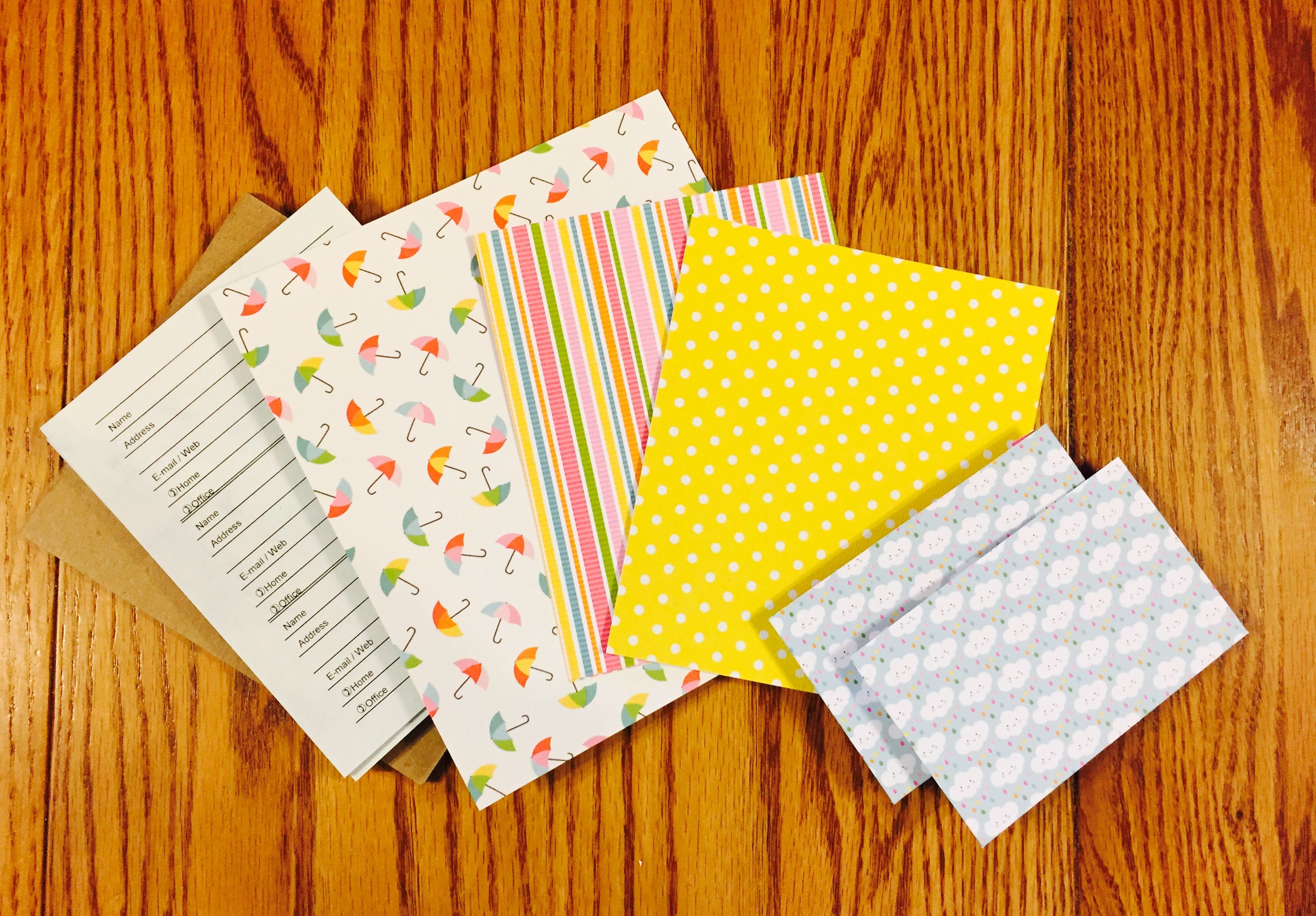 My contact information section looks the same as it did previously, except that there is space for 102 more entries. I used a linen paper called Royal Marble Smooth in Blue from Wausau Papers that I’ve had forever. It looks a bit like a wispy sky, so it seemed to be the perfect match for the April Showers challenge.