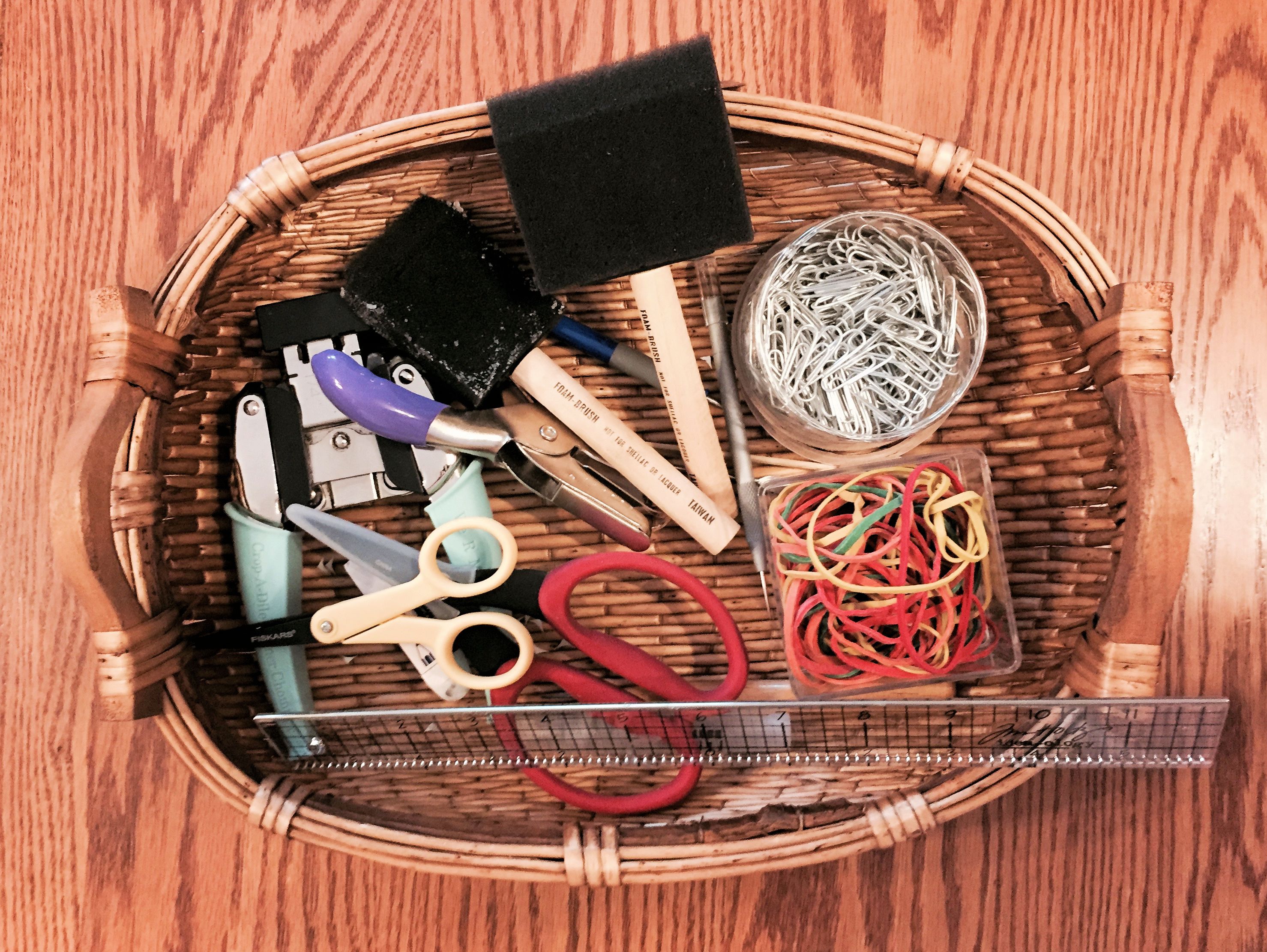 Arrange your most frequently used tools and supplies within arm’s reach. This allows you to be efficient and productive during whatever time you may have available, however short that may be. I don’t put away all of my tools after each work session, for example. Instead, I have a basket filled with my most frequently used tools. This is moved to my work space (usually the kitchen table).