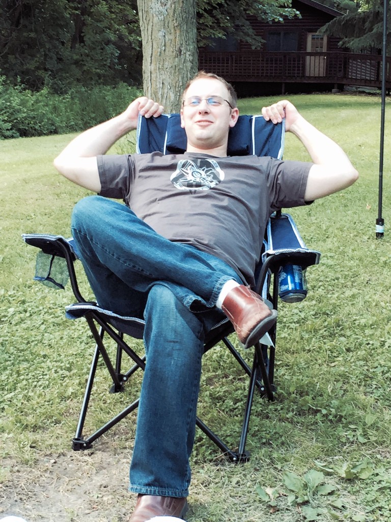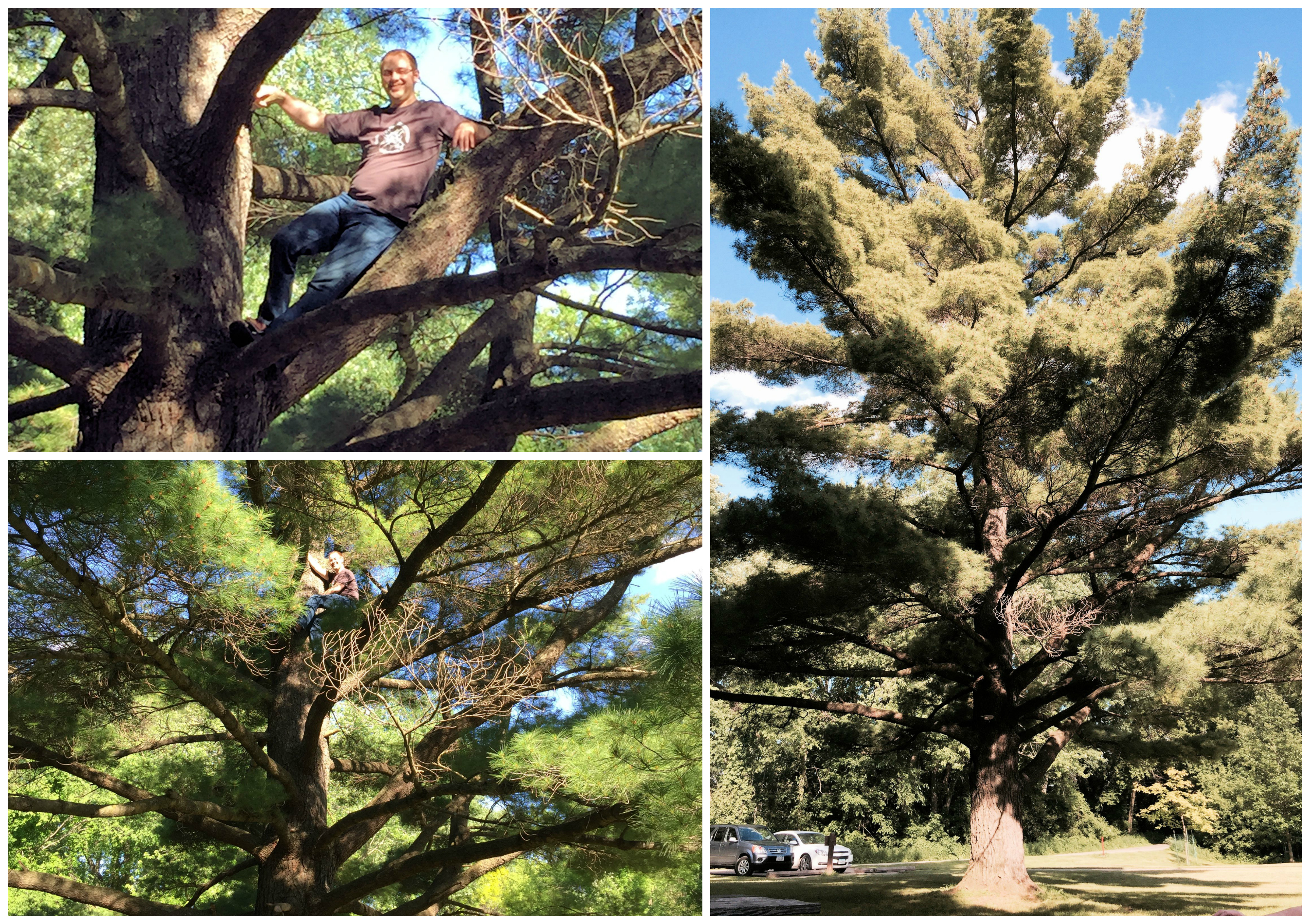 In front of our cabin is an immense, mature pine tree that provides a lot of shade over our fire pit and picnic table. David couldn’t resist climbing it—probably to make me nervous, as I’m not fond of heights.