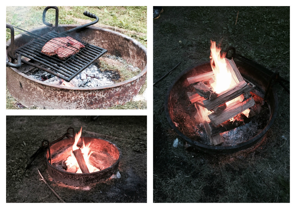 Every evening but Thursday, when it rained buckets all day, we grilled our dinner outdoors over the fire pit, and sometimes we enjoyed roasted marshmallows much later, when the stars came out. But there was at least one fire every night but Thursday, filled with appropriate chat and silence, in equal measures. One night after our dinner campfire, we took a walk along the East Trail Lake. When we returned a couple of hours later, David stacked the wood chimney-style and blew on the still-hot embers to get a second campfire started.
