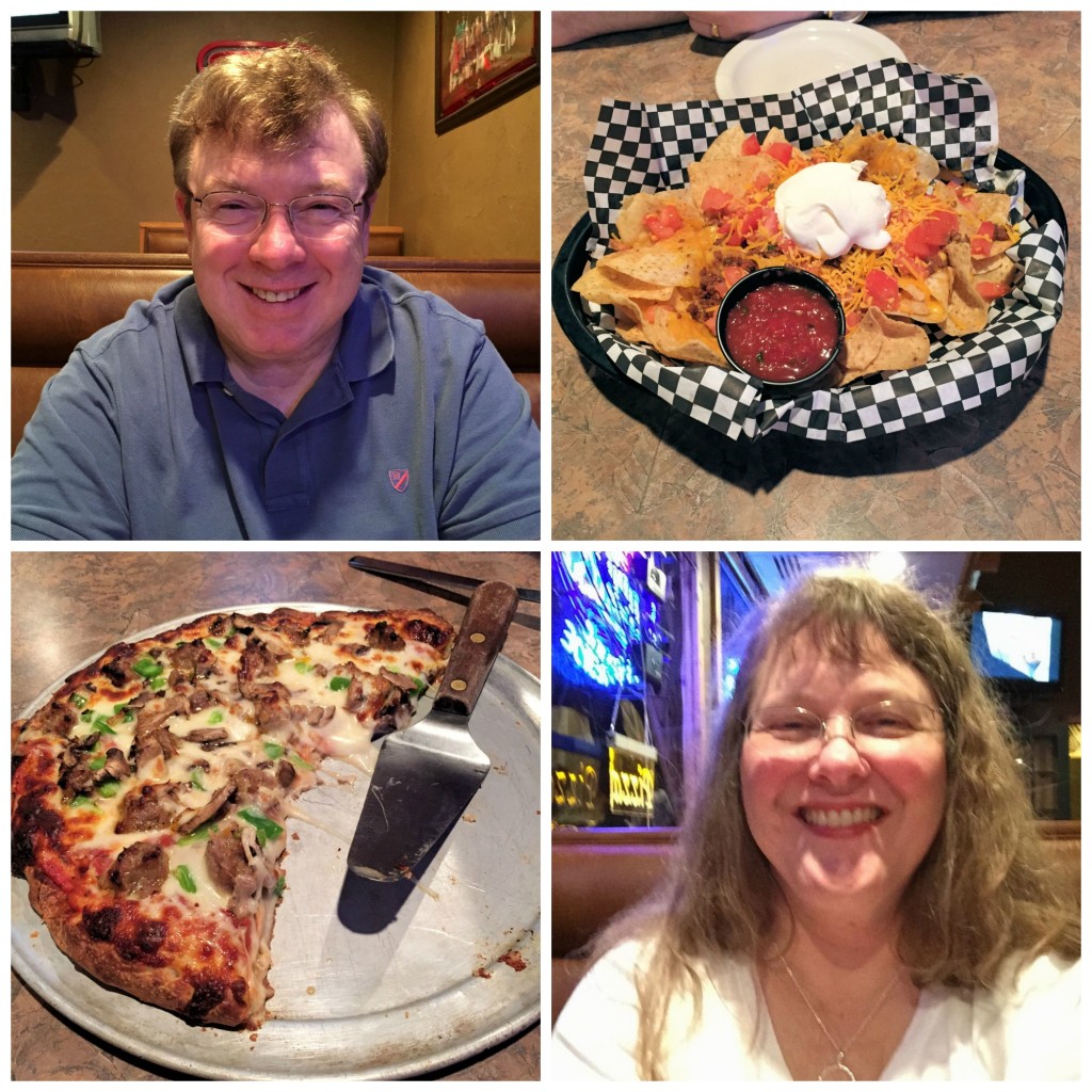 We checked into our cabin on Friday evening. By the time it was eight-thirty, we were hungry but still not completely unpacked, so we drove into Manchester for supper at the Fireside Pub & Steakhouse, where we enjoyed nachos and the best pizza (really!) we have ever eaten. You can tell from our happy faces that the food hit the spot! If I had thought about it, I would’ve handed the server my iPhone to snap our picture, but I didn’t think of it at the time and instead took individual shots of us.
