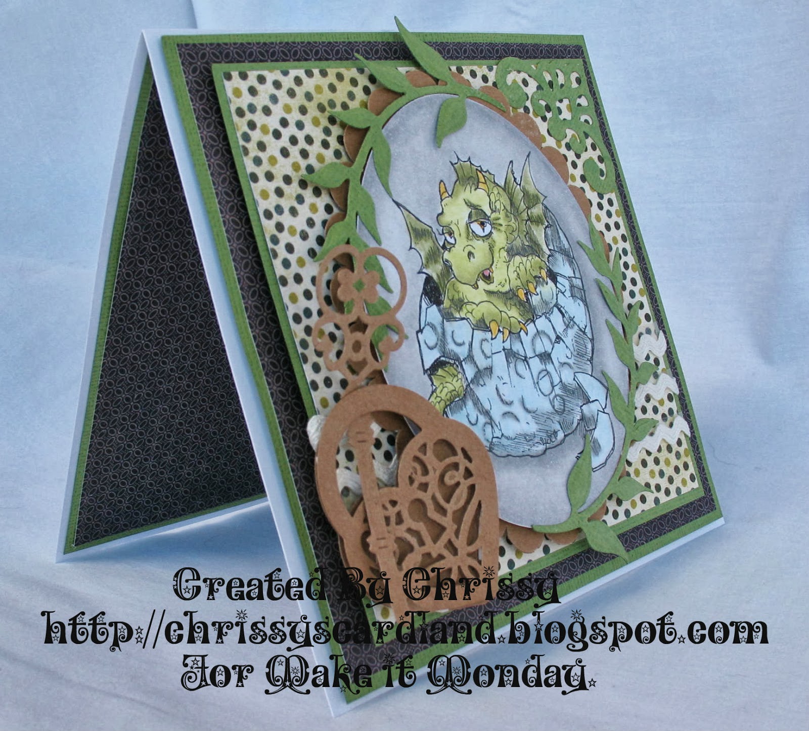 Chrissy of Chrissyscardland created an adorable birthday card with the locket and key dies in A BIRFDAY DRAGON WITH MAKE IT MONDAY. Using her Faber-Castell colored pencils, Chrissy colored a digital dragon image designed by Rick St. Dennis. She cut out some leaves using a Couture Creations die, and combined these and the Spellbinders® Love Locket dies with the illustration.
