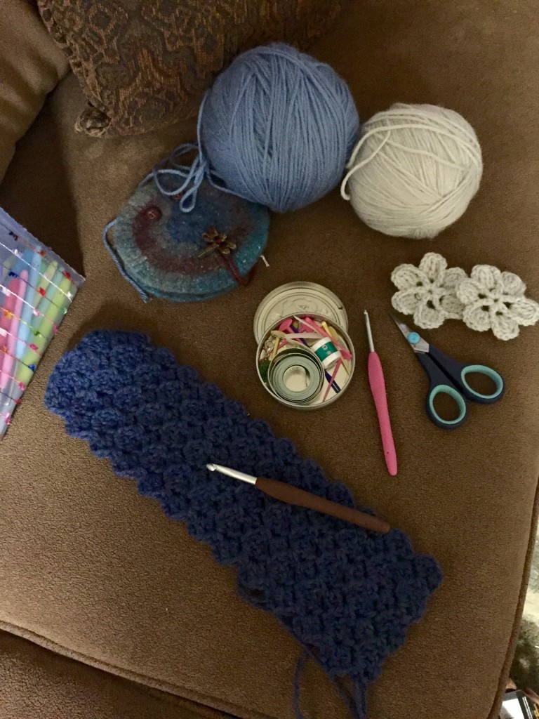 Keep the hands busy. Everywhere you look, I have UFOs (UnFinished Objects) scattered all over the house. There are balls of yarn on the family room couch in the basement, waiting to be crocheted. There are projects bags filled with linen fabric, colored threads and beads, waiting to be stitched up. There are boxes—yes, stacked boxes—of fabric, waiting to be sewn up into organizers, journal covers, purses, place mats and more. There are stacks of card stock and printed papers on the verge of being turned into handmade books. And finally, there are lists of project ideas that will likely never see the light of day. I perpetually lament not having enough time to get things done, but the reality is that I will never have enough time in this lifetime to get it all done. Who does? But you’ll never get anything finished if you don’t start. Just keep the hands busy, and do it. Get used to doing what you can with the time that you have, and don’t look back.