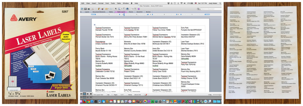 For my clear protective pockets, I use Avery Laser Labels 5267. Please note that these labels work for both laser and inkjet printers. The labels are compact, measuring ½ inch by 1-3/4 inches, and come 80 labels to a sheet. I use Arial Narrow in a 10-point font to identify the die’s manufacturer, design and item number.