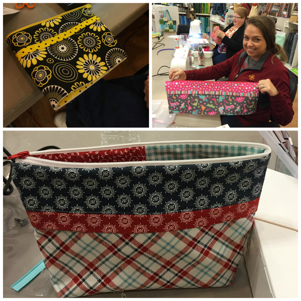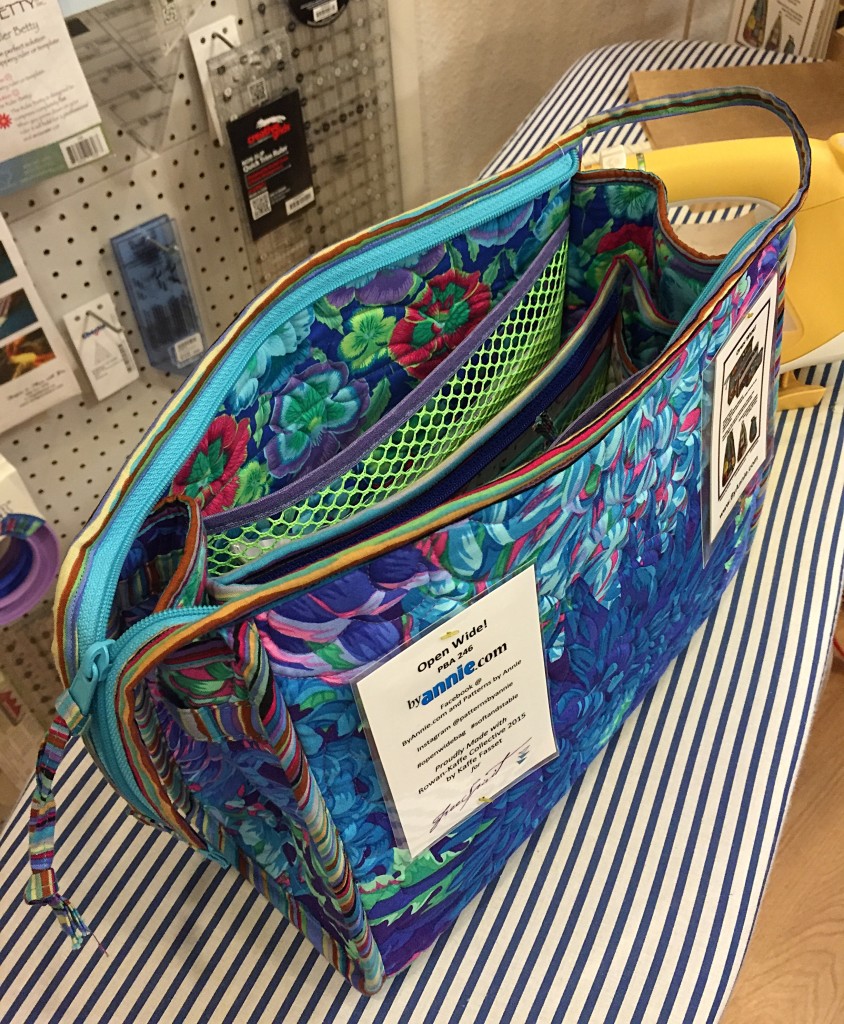 When I visited Quilter’s Cupboard today to take photos for this post, several women were engaged in a sewing class, making Becca Bags from Lazy Girl Designs. What makes these “stow and go†bags extra special is the easy circular One-Zip technique, which involves cutting a zipper apart, removing the pull, and stitching in one side of the zipper tape straight and flat. Bring the ends of the zipper together and slide the zipper pull back on. When you open the bag, the zipper installation allows the bag to open up wide, and the bag stands on its own.