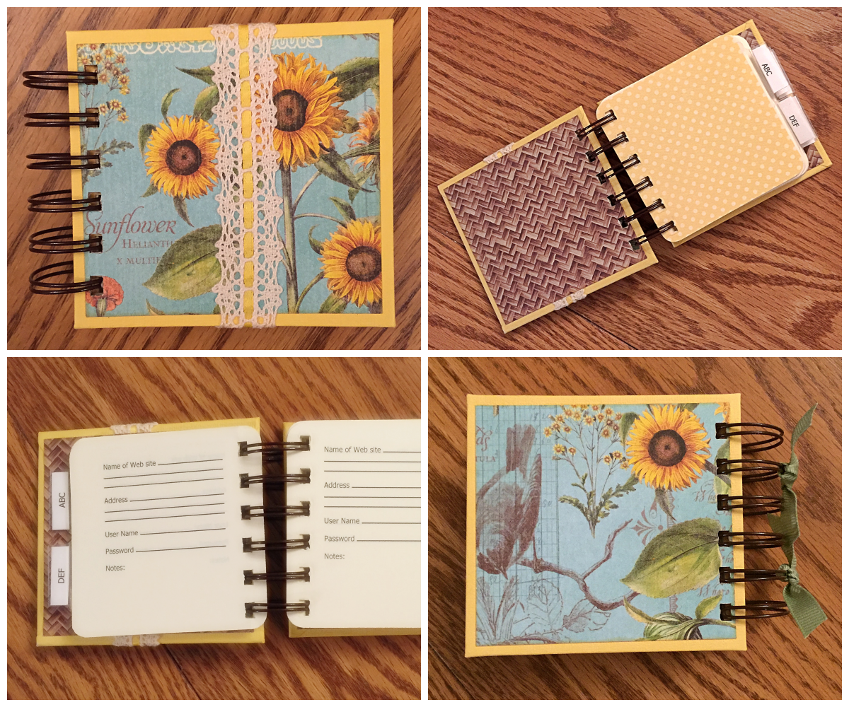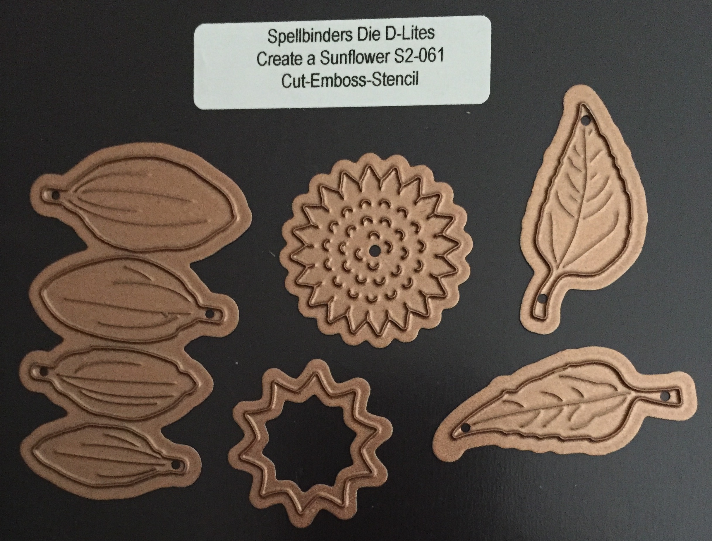 The perfect opportunity to use my Spellbinders Create a Sunflower die set occurred last month when a customer requested a password book with a sunflower embellishment. The five-piece die set includes petals, a starburst-shaped petal base, a floral center, and two leaves.