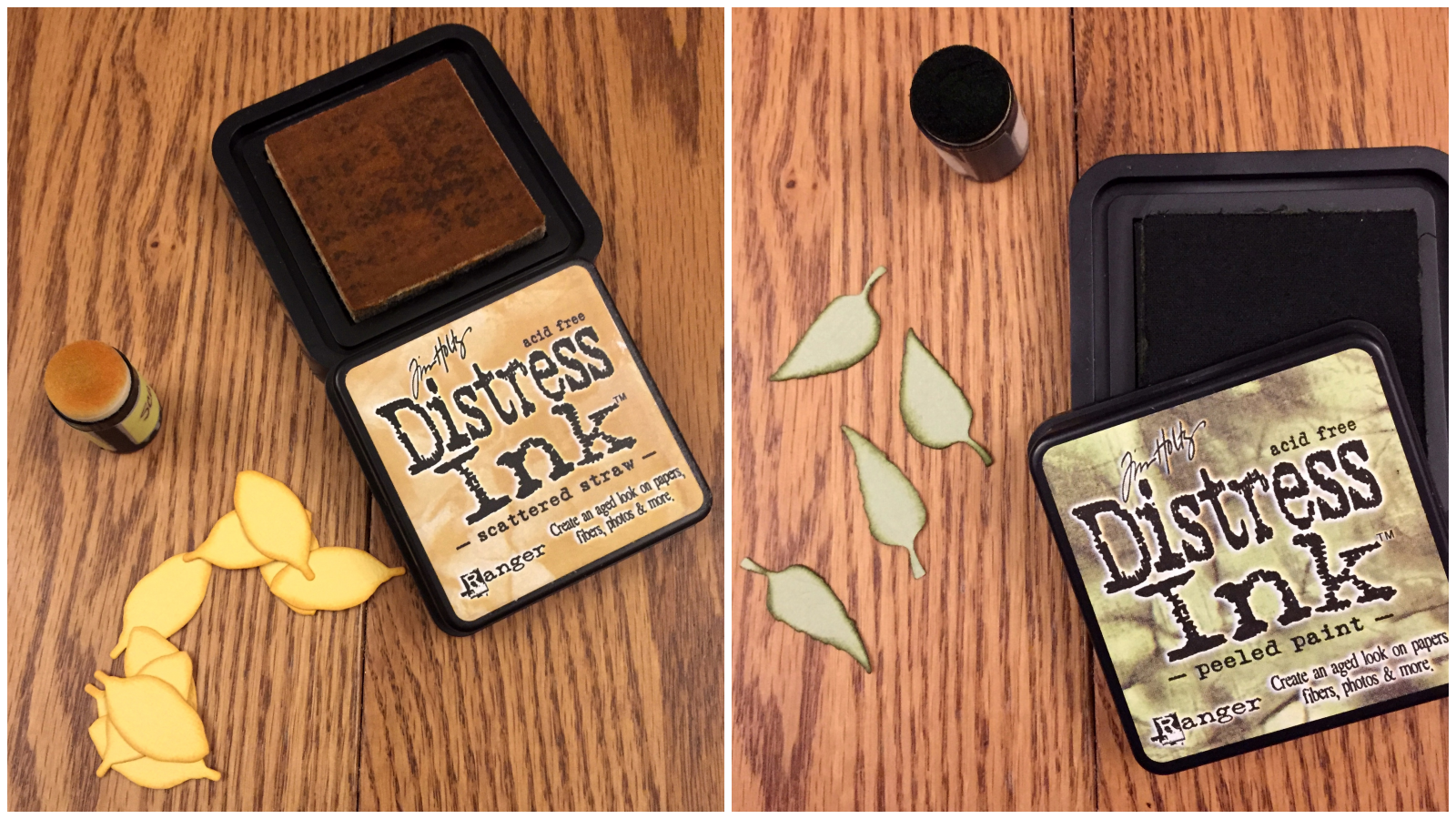 I began the process of assembling the sunflower by inking the edges of the petals and leaves with Tim Holtz Distress Ink. I used Scattered Straw for the petals, and Peeled Paint for the leaves. It’s not absolutely necessary to ink the edges of your paper, but I think it defines the small pieces better if you do so.