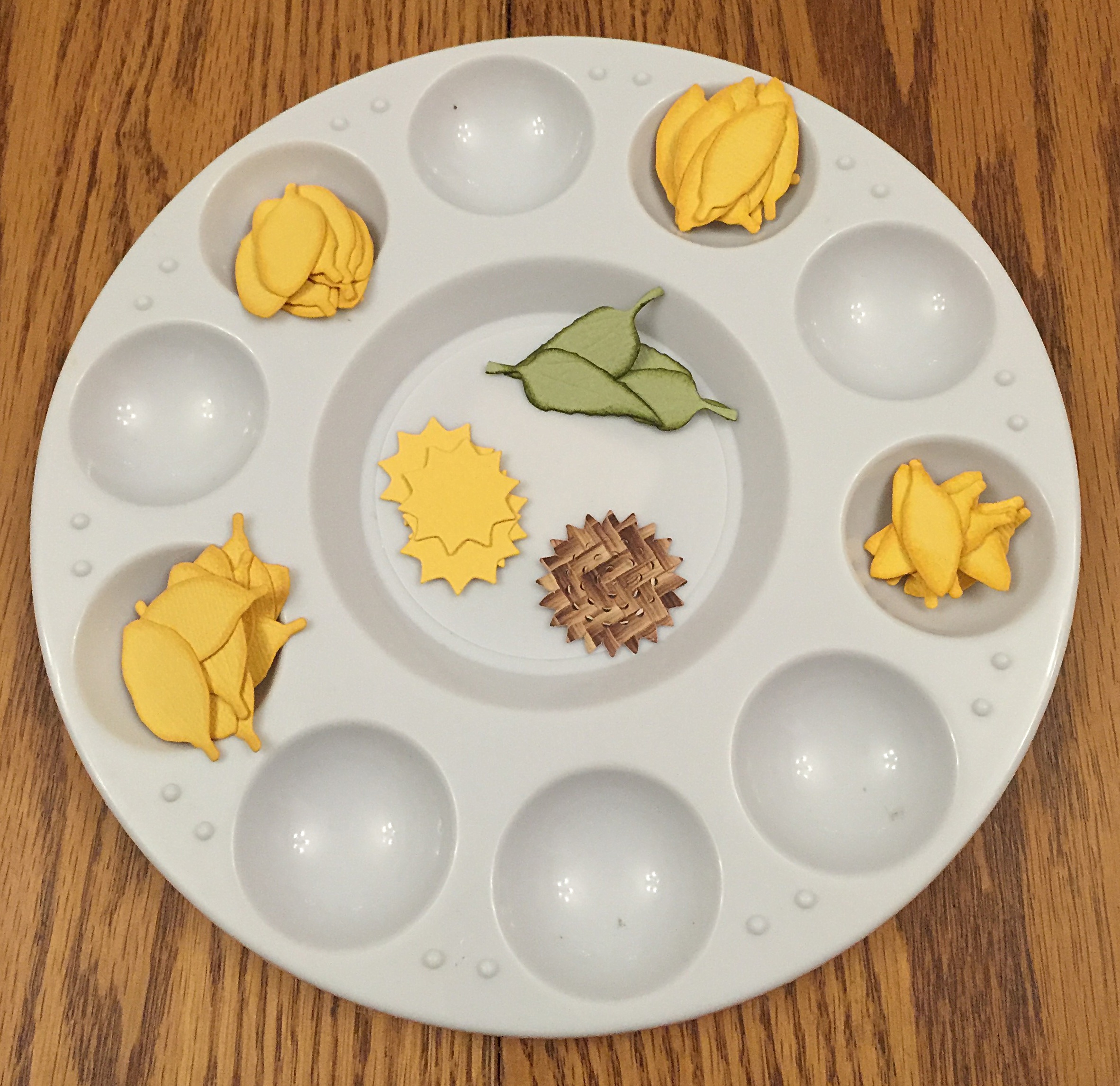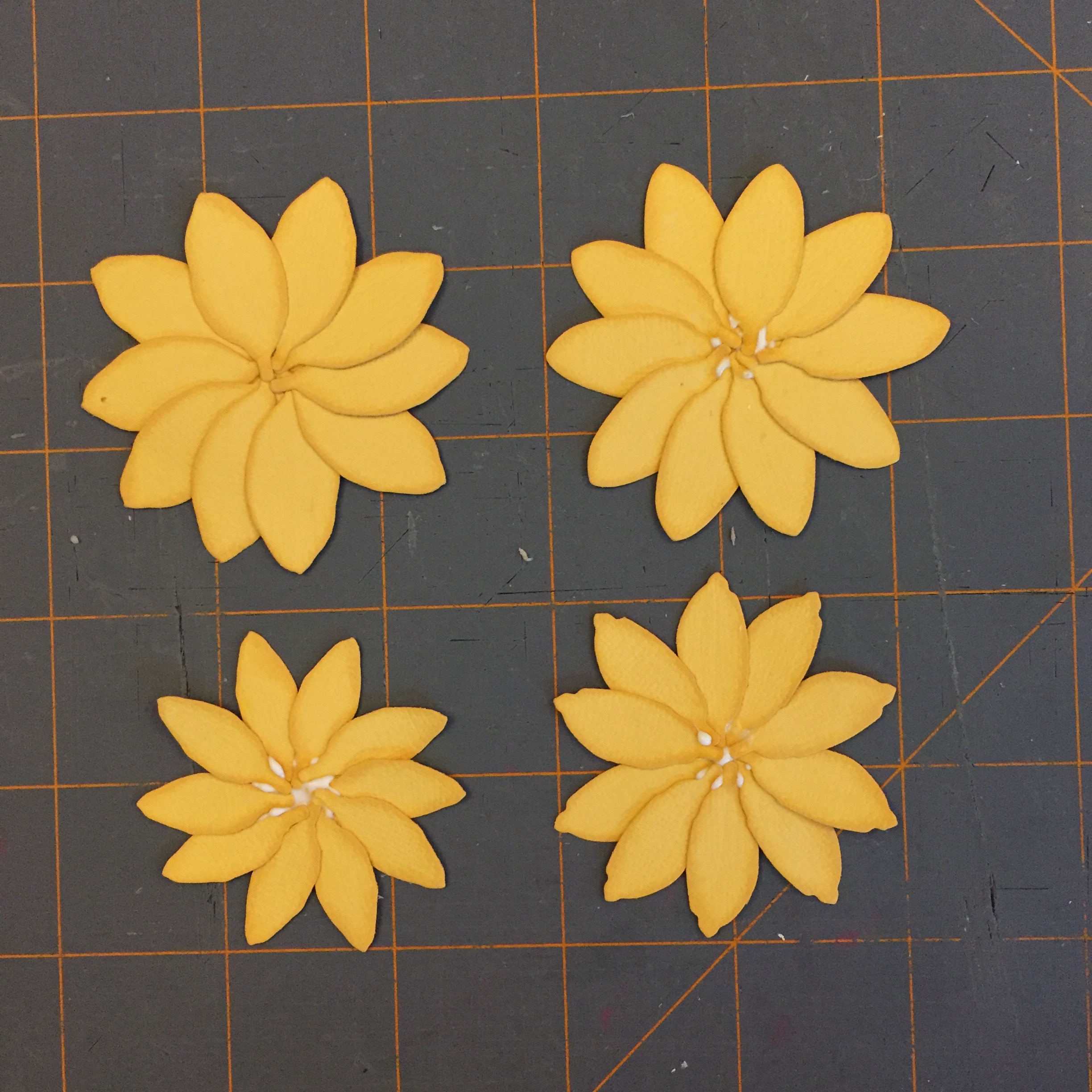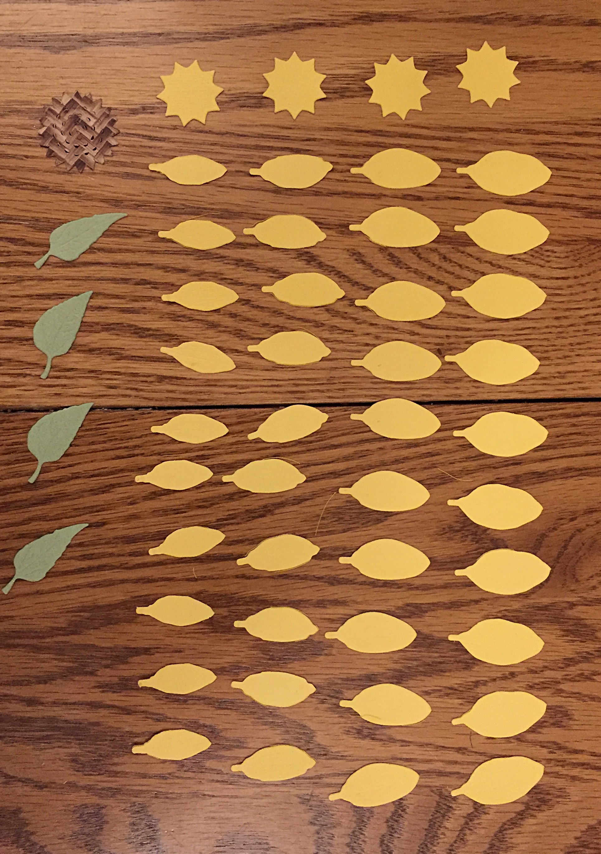 You start off by die cutting 10 sets of yellow petals and four yellow petal bases, one brown floral center, and as many leaves as you’d like. I punched out four leaves and used all of them.