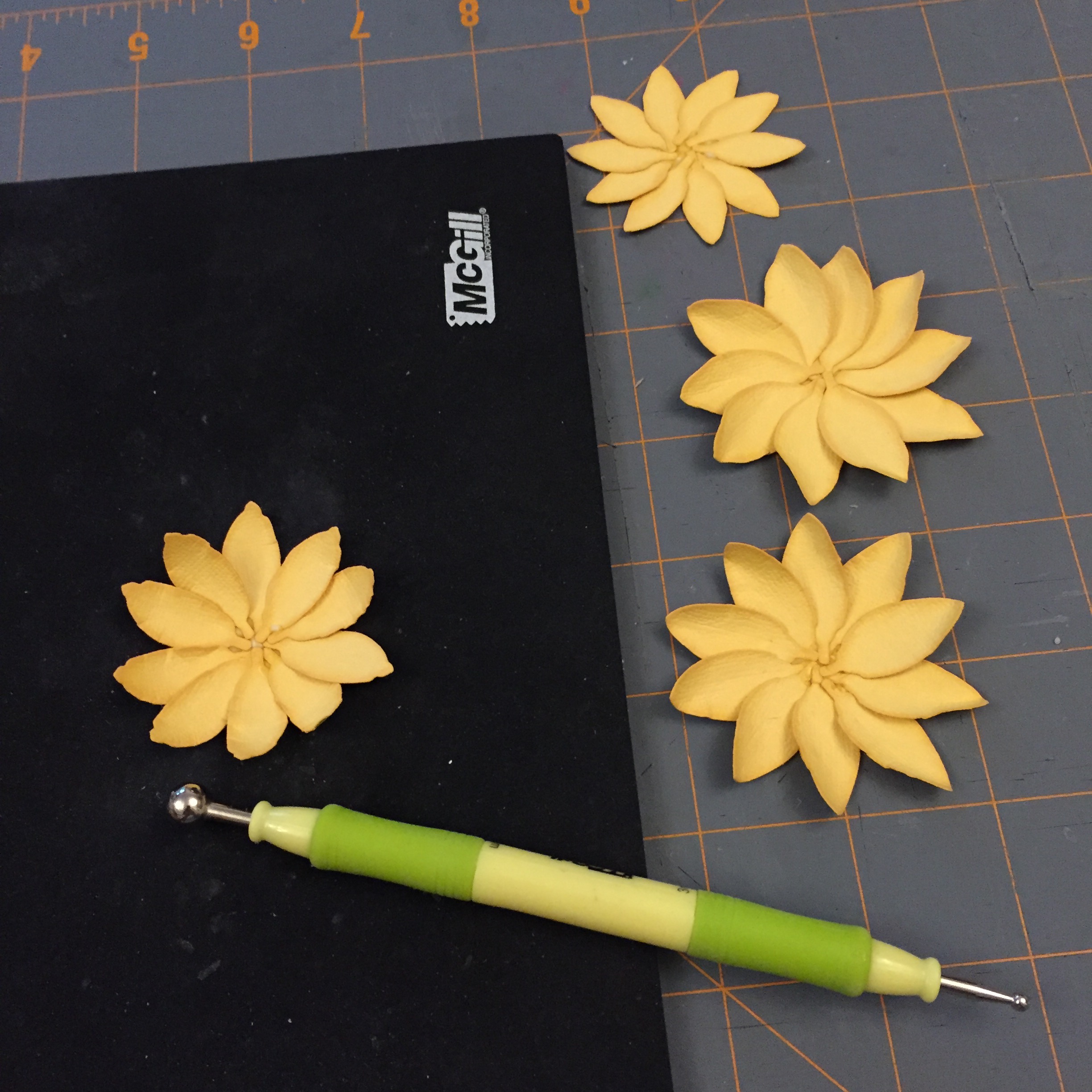 I used a McGill stylus and molding mat to add dimension to the petals, using the ball of the stylus in a circular motion to break up the fibers of the paper and curl the leaves a little bit. Don’t have a stylus? Use the capped end of a felt-tipped marker and a mouse pad.