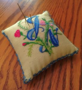 One of the things I have discovered about sewing is that it’s a community—whether a friend is helping you lay out pattern pieces and interpret the instructions—or you are participating in the online version of an old-fashioned sewing bee, such as the Bag of the Month Club in which I have participated during the last few years. Sewists share photos of completed projects on Facebook, Pinterest, Instagram and blogs; participate in blog hops, and meet in local library conference rooms, school classrooms and church meeting rooms to quilt, chat and snack. They discuss handy sewing techniques and recommend notions to each other while standing in the fabric store aisles, becoming fast friends on the fly. At one of the first jobs I worked at in southern California, during our first year of marriage, an instant bond grew out of a shared love for sewing when my co-worker presented me with a pin cushion she embroidered by hand, well-loved, worn, and still sitting in my sewing room.