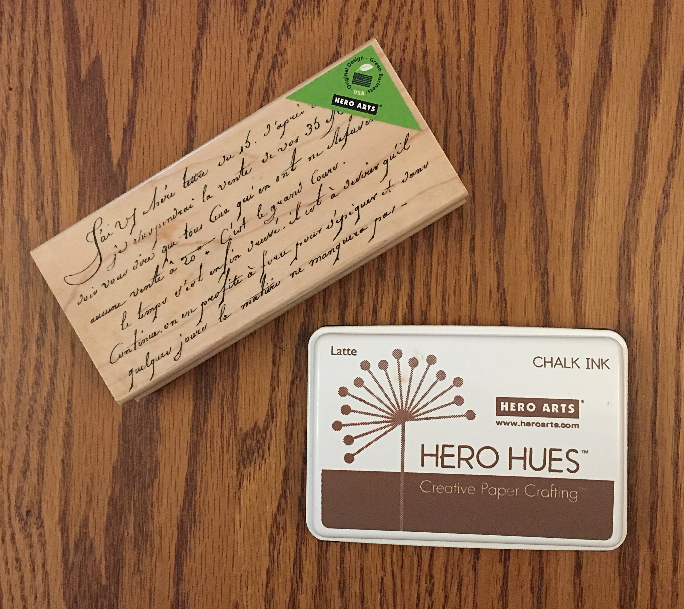 To re-create the flower, I stamped white Bazzill card stock with an Old French Writing rubber stamp by Hero Arts and brown Hero Hues Latte Chalk Ink, also by Hero Arts.