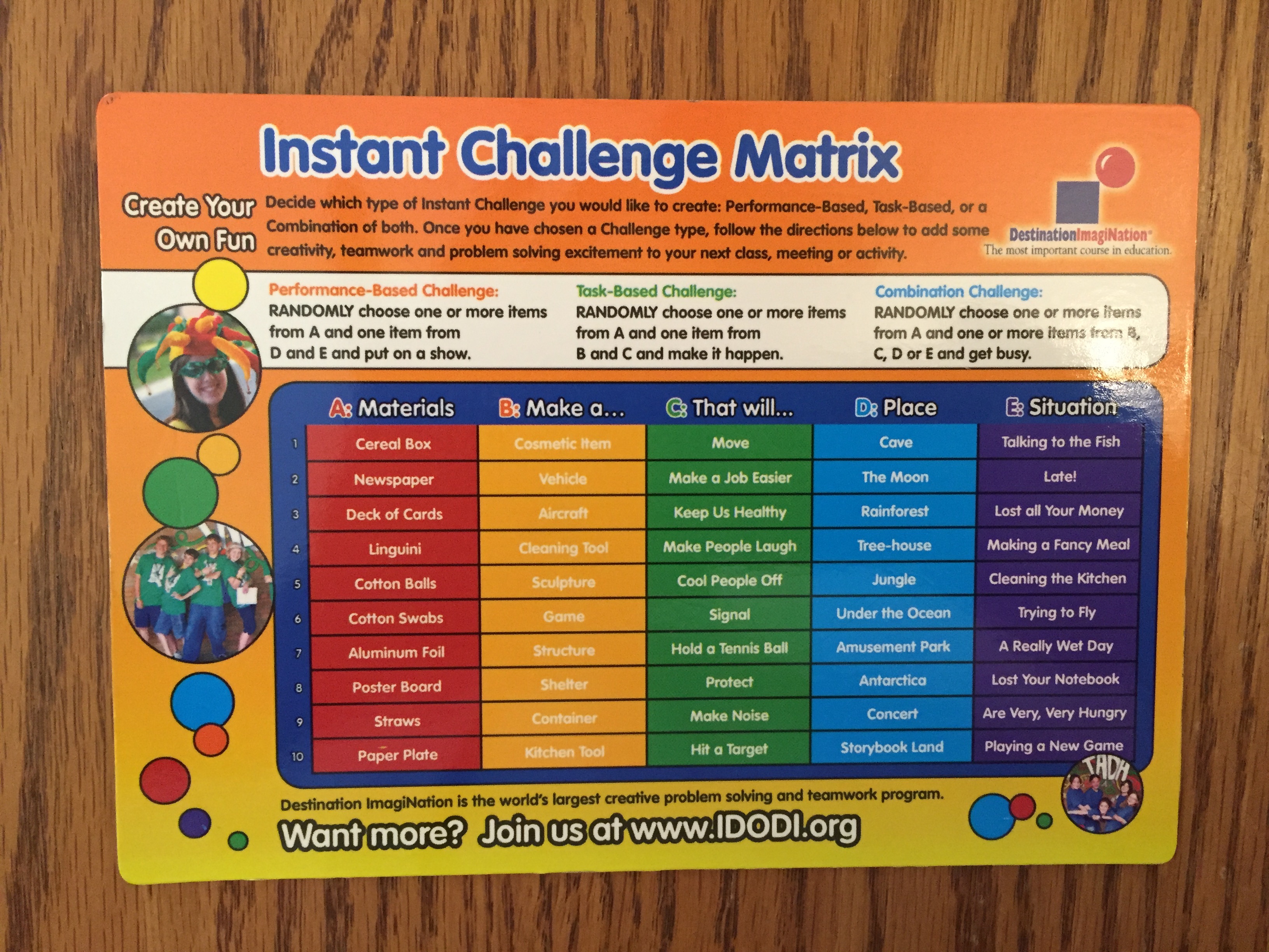 Writing prompts can, of course, appear in other forms besides starter sentences. Photos or illustrations can work exactly the same way. Other times, you may be presented with a what-if scenario, but then have to develop the characters, plot, setting and motivations. When I wrote Destination Imagination Instant Challenges for cre8iowa’s Instant Challenge Library, or on-the-spot creative problem-solving exercises, I sometimes used a matrix approach as a jumping-off point. The basic idea behind this prompt method is to combine one or more elements from charted rows and columns.